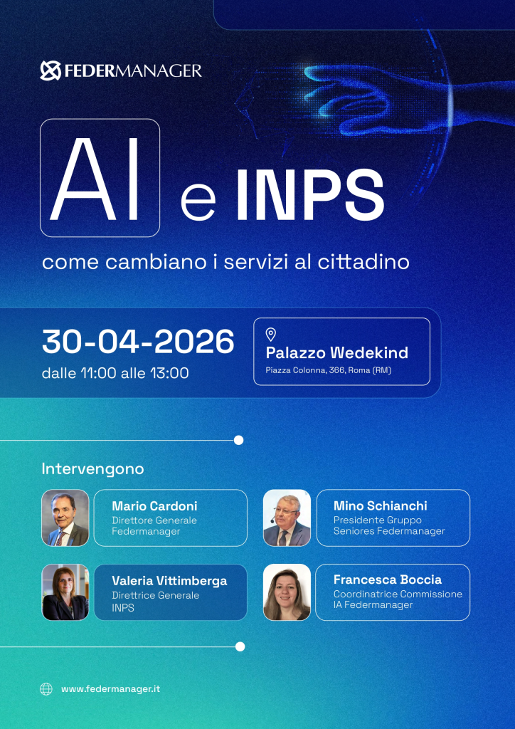 Giovedì 30 aprile 2026, dalle ore 11.00 alle ore 13.00, presso Palazzo Wedekind (Piazza Colonna 366 – Roma), si terrà l’evento dal titolo “AI e INPS: come cambiano i servizi al cittadino”, promosso da Federmanager e da Inps, con la partecipazione di Mario Cardoni, Direttore Generale Federmanager, Mino Schianchi, Presidente Gruppo Seniores Federmanager, Francesca Boccia, Coordinatrice Commissione AI Federmanager e per INPS di Valeria Vittimberga, Direttrice Generale del Fondo , che porteranno il punto di vista dei manager e dei pensionati su una trasformazione che riguarda da vicino la nostra quotidianità.